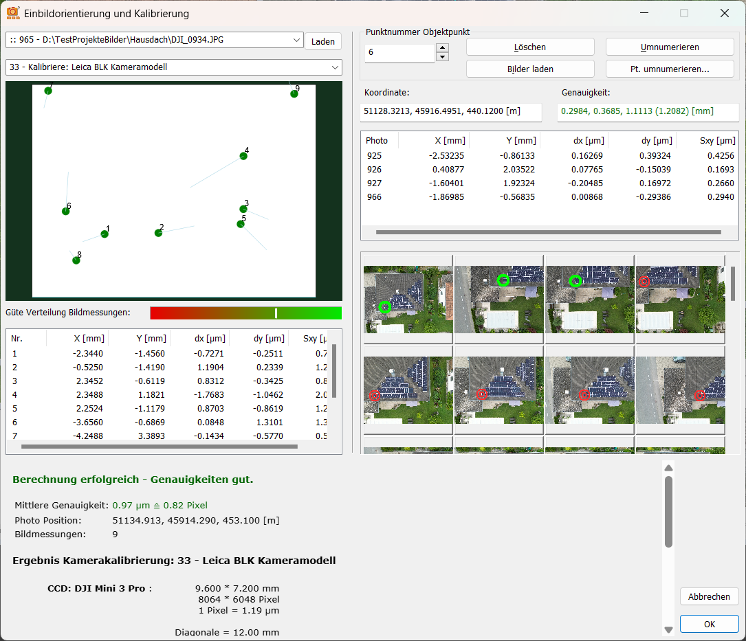 Achten Sie darauf, dass die Punkte im zu orientierenden Bild möglichst gleichmäßig verteilt sind. Die Anzeige „Güte der Verteilung der Bildmessungen“ sollte sich im grünen Bereich befinden.